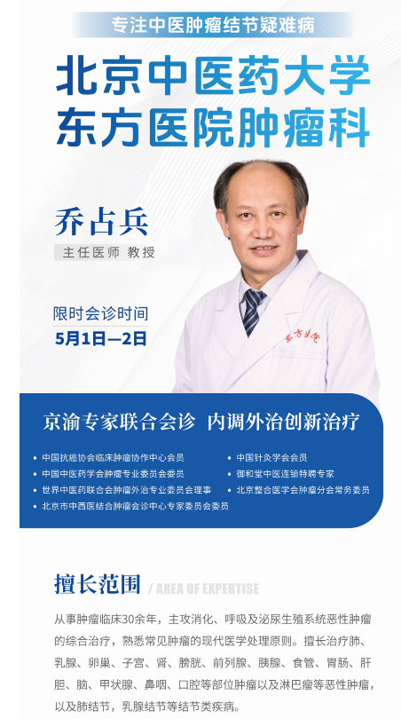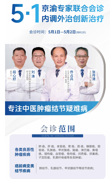 五一假期,重庆御和堂诚邀您与北京权威专家面对面交流,为健康“把脉定向”。无论是肿瘤、结节等慢性病,还是呼吸、心血管系统常见疾病,乔占兵教授团队都将以专业视角、创新,为您提供科学、有效的治疗建议。